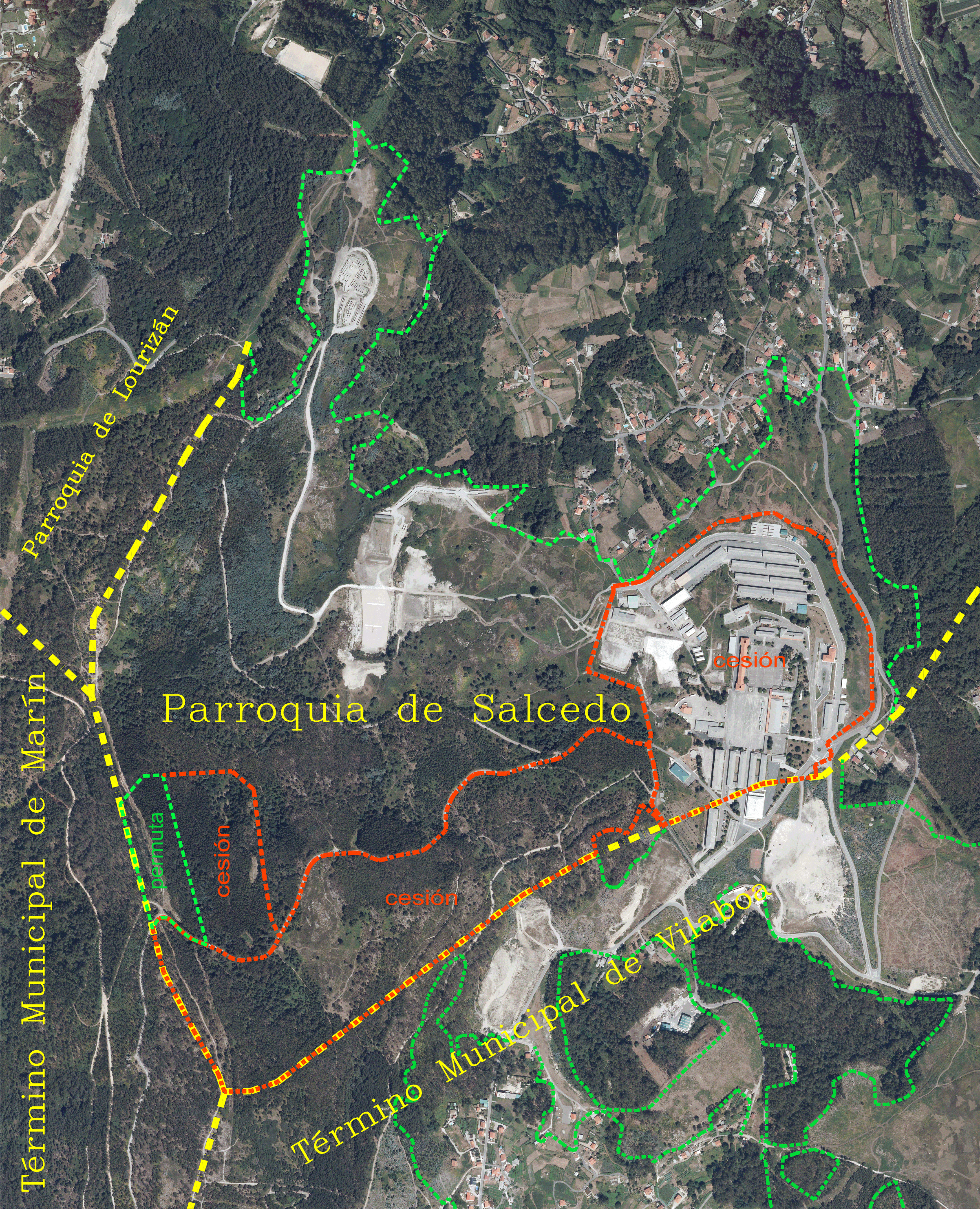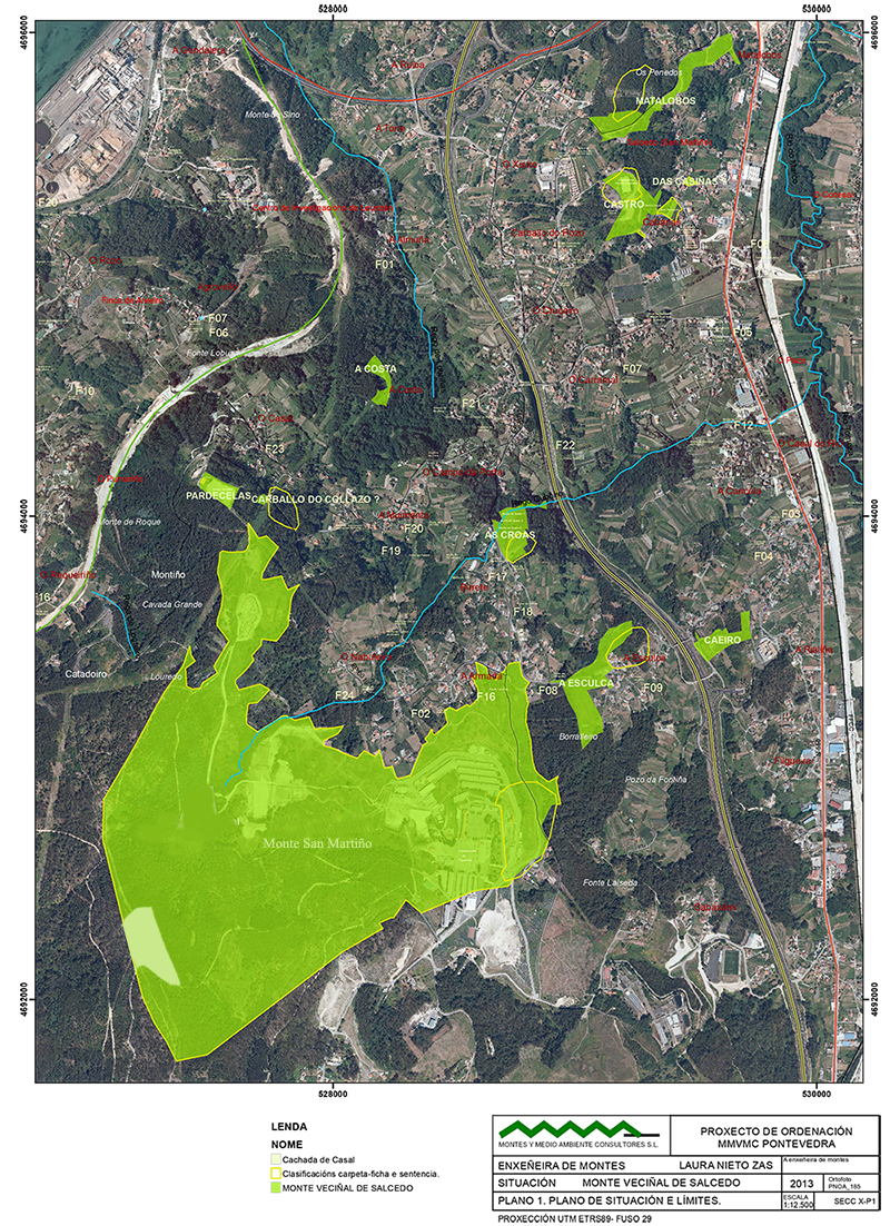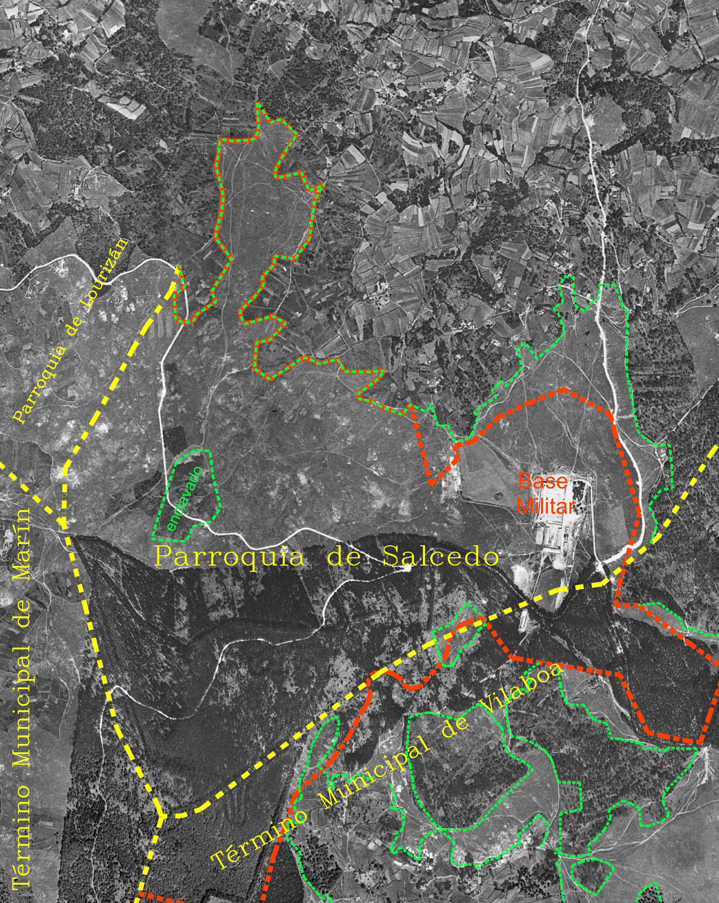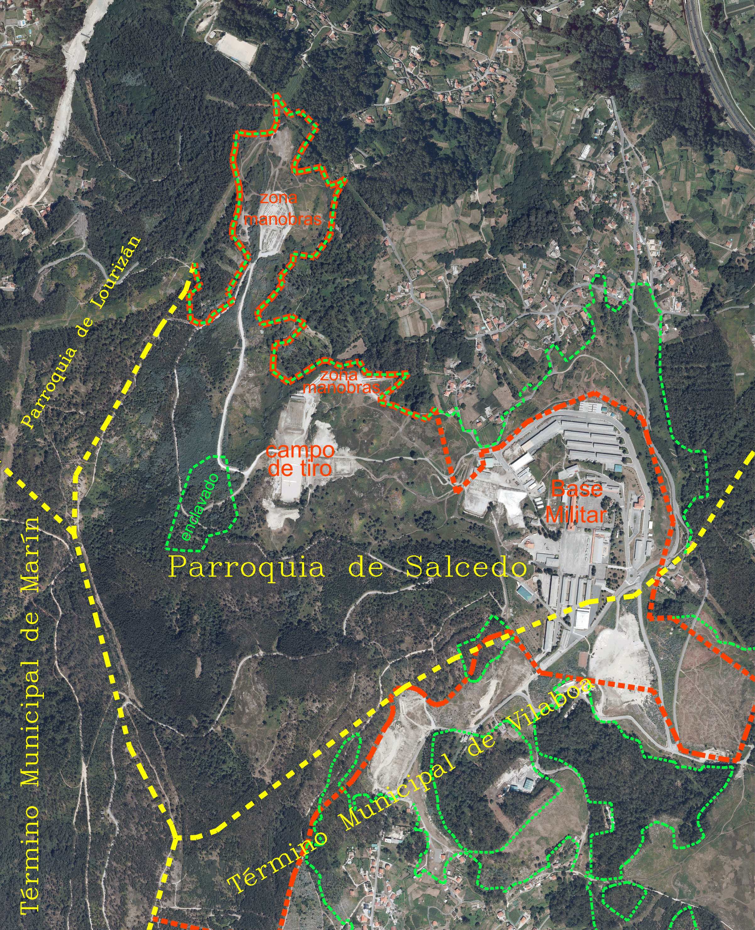Plano do monte no ano 1965 trala cesión gratuíta do Concello de Pontevedra que abranguía case todo o monte (liña laranxa), sobre o fotograma do voo americano do ano 1956 no que se ve a base militar daquela e as repoboacións forestais. Plano do monte no ano 2010 cando se iniciou o preito (a mesma liña laranxa da cesión gratuíta do ano 65), coa base militar e as zonas de manobras e o campo de tiro. Plano do monte no ano 2015 sobre o mesmo fotograma anterior, coa permuta e as cesións recentes.