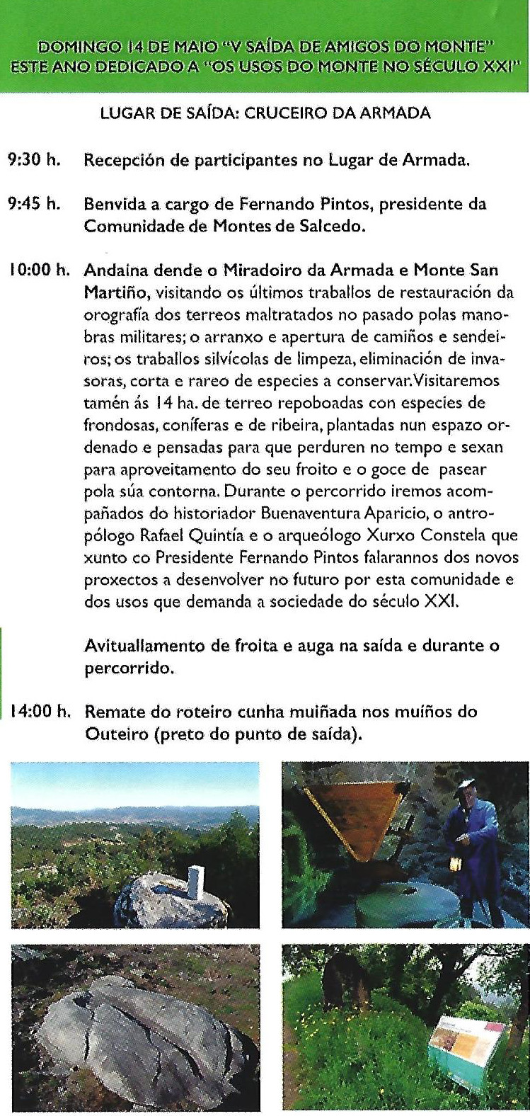 O día 14 de maio de 2017 a Comunidade convoca a todos veciños da Parroquia e demais cidadáns a V SAÍDA DE AMIGOS DO MONTE NA PARROQUIA DE SALCEDO.